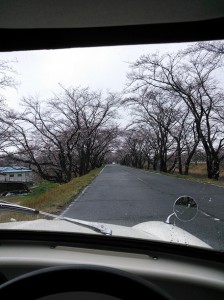 雨の中、咲きかけの桜のトンネルを走っていきました。