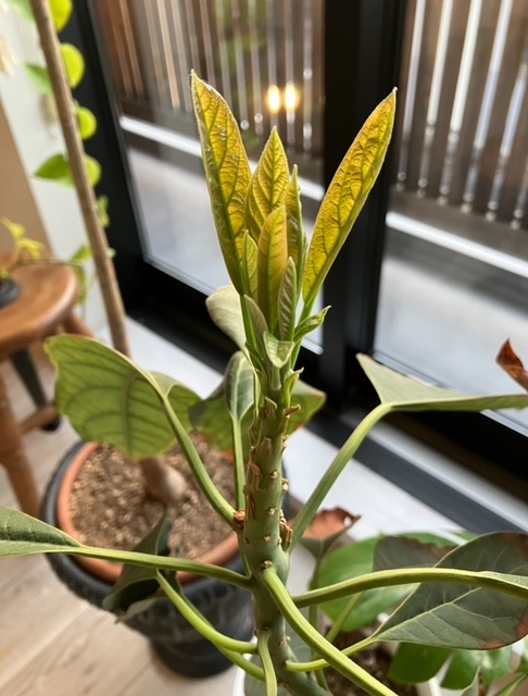 しばらく成長を止めていたアボガドくん、新しい葉が出てきました。